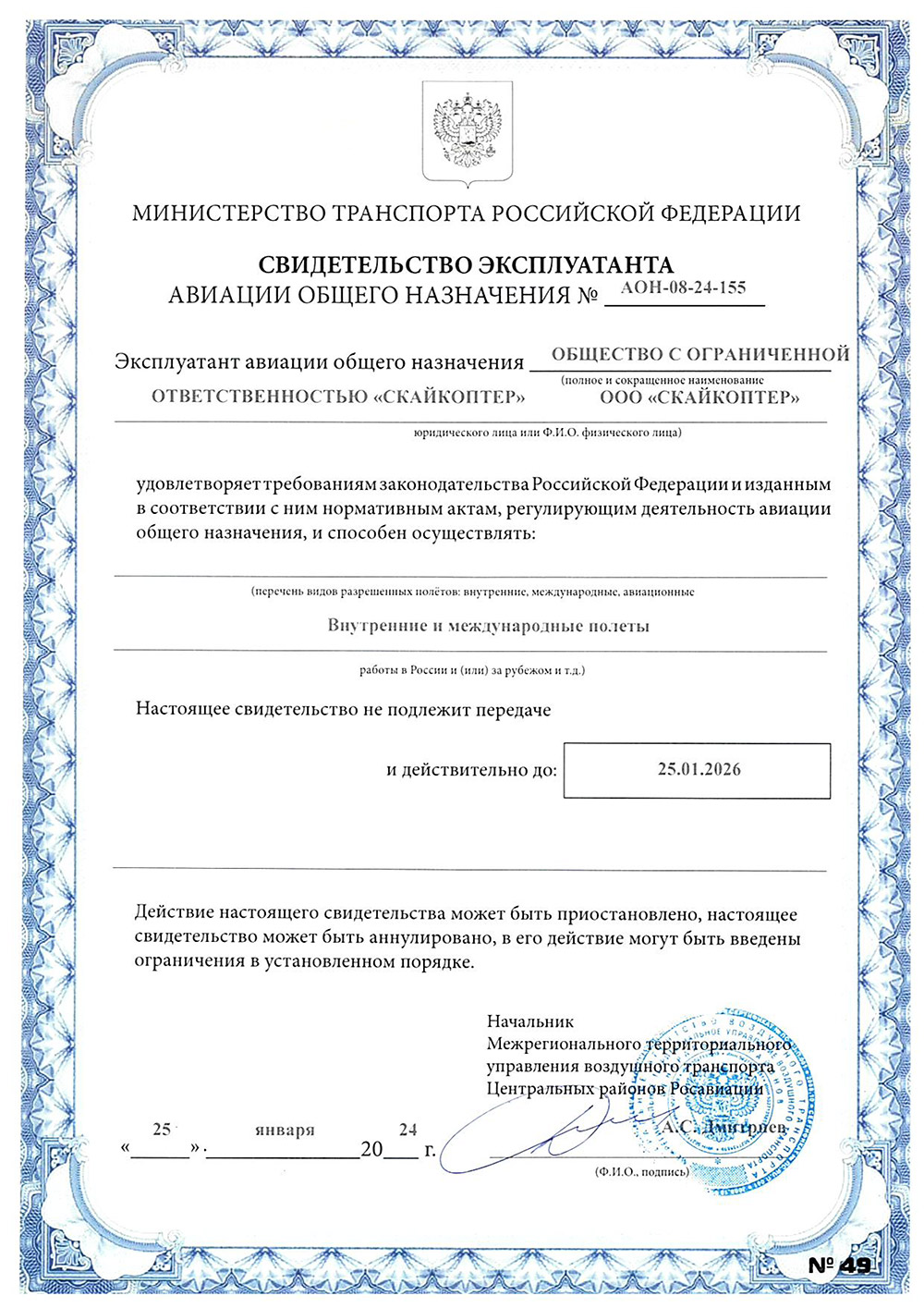 Успешно пройденная компанией сертификация эксплуатанта общего назначения от Федерального агентства воздушного транспорта РФ позволила нашим клиентам получать услуги по операционному и техническому менеджменту воздушных судов.